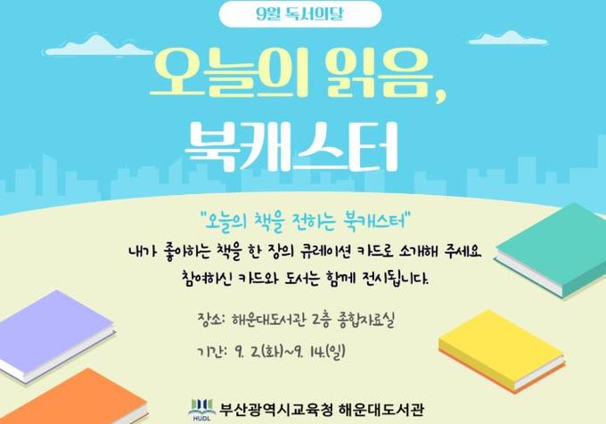[경남도민뉴스=김채연 기자] 부산광역시립해운대도서관은 오는 9월 2일부터 14일까지 해운대도서관에서 지역 주민을 대상으로 ‘오늘의 읽음, 북캐스터’행사를 운영한다.