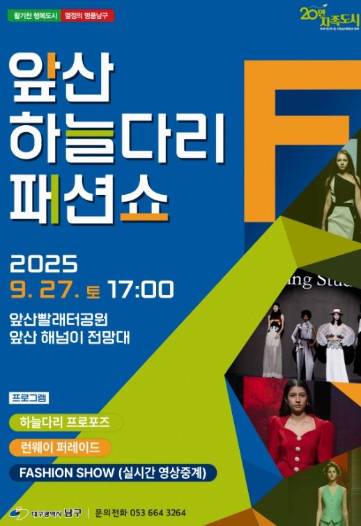 [경남도민뉴스=백상현 기자] 대구 남구는 오는 9월 27일 지역의 대표 관광명소인 앞산빨래터공원에서 하늘다리 패션쇼와 프러포즈 이벤트를 개최한다고 밝혔다.