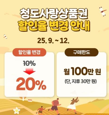 [경남도민뉴스=최민숙 기자] 청도군은 지역경제 활성화를 위해 오는 9월 1일부터 연말까지 청도사랑상품권의 할인율을 기존 10%에서 20%로 상향 조종해 할인 판매한다고 밝혔다.