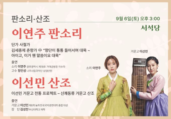 [경남도민뉴스=최현인 기자] 광주문화재단 전통문화관은 오는 9월 6일(토) 오후 3시, 열일곱 번째 토요 상설공연을 선보인다.