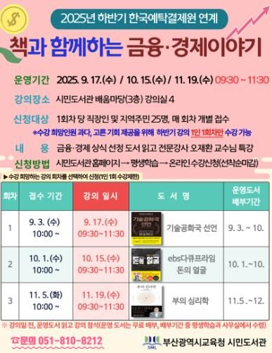 [경남도민뉴스=김채연 기자] 부산광역시립시민도서관은 오는 17일부터 11월까지 매월 셋째 수요일 시민도서관 강의실 4에서 성인 25명을 대상으로 ‘책과 함께하는 금융·경제 이야기’를 운영한다.