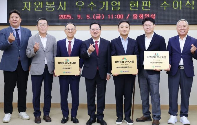 [경남도민뉴스=도문호 기자] 대전시는 5일 시청 중회의실에서 자원봉사활동이 우수한 기업 3곳에 ‘2025년도 자원봉사 우수기업’ 현판을 수여했다.
