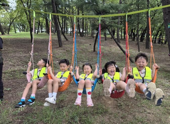 아이들은 자연을 관찰하고 탐구하며, 숲에 설치된 밧줄을 활용해 균형 감각과 협동심을 기를 수 있다.