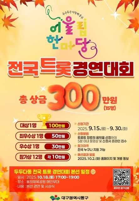 [경남도민뉴스=백상현 기자] 대구 동구청은 2025년 동구 어울림한마당 ‘두두다동’ 프로그램의 일환으로 열리는 전국 트롯 경연대회의 참가자를 오는 30일까지 모집한다.