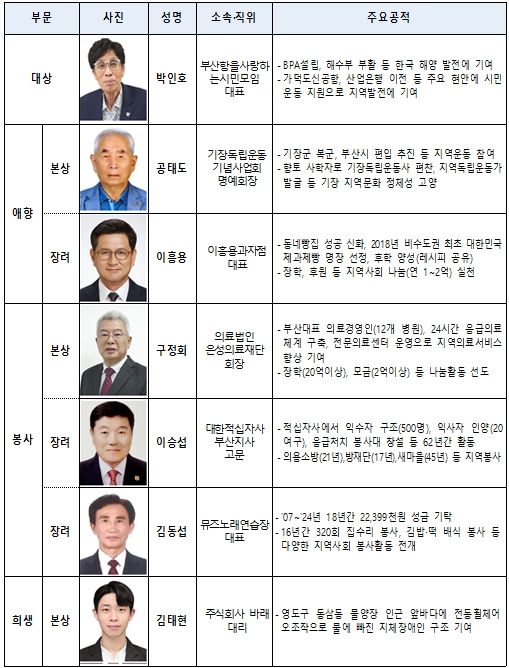 ▲[애향 부문] 본상에는 공태도 '기장독립운동기념사업회' 명예회장, 장려상에는 이흥용 '이흥용과자점' 대표 ▲[봉사 부문] 본상에는 구정회 의료법인 '은성의료재단' 회장, 장려상에는 이승섭 '대한적십자사' 부산지사 고문과 김동섭 '뮤즈노래연습장' 대표, ▲[희생 부문] 본상에는 김태현 '주식회사 바래' 대리가 각각 선정됐다.