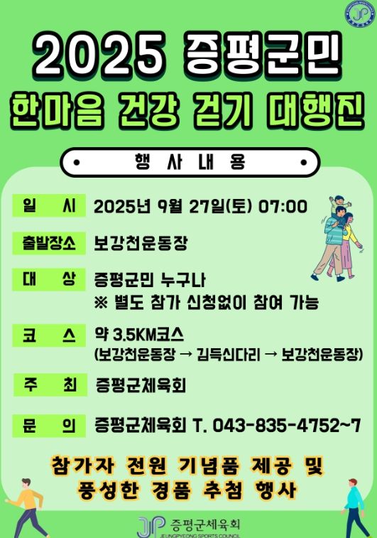 [경남도민뉴스=박만수 기자] ‘2025 증평군민 한마음 건강걷기대행진’이 오는 27일 오전 7시, 증평 보강천 운동장에서 열린다.