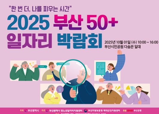 [경남도민뉴스=신석주 기자] 부산시는 내일(10월 1일) 오전 10시부터 오후 4시까지 부산시민공원 다솜관 일대에서 신중년 세대의 인생 2막 도전을 지원하는 '2025년 부산 50플러스(+)일자리 박람회'를 개최한다고 밝혔다.