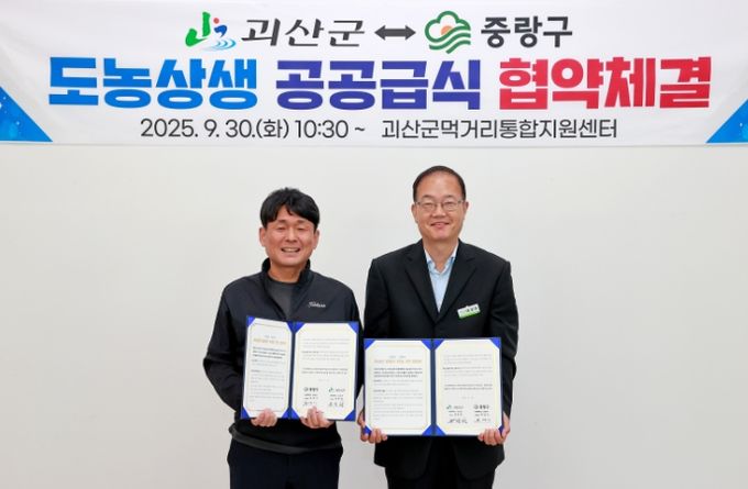 [경남도민뉴스=박만수 기자] 충북 괴산군은 30일 괴산군먹거리통합지원센터에서 서울특별시 중랑구와 도농상생 공공급식 협약을 체결했다고 밝혔다.