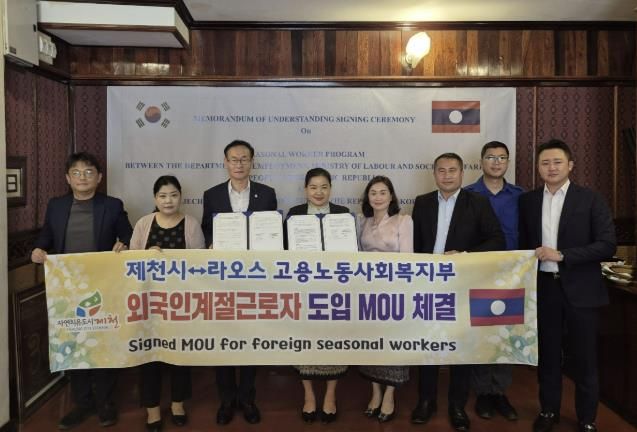 [경남도민뉴스=박만수 기자] 제천시는 지난 9월 30일 라오스 노동사회복지부와 외국인 계절근로자 도입을 위한 신규 업무협약(MOU) 을 체결했다. 이번 협약은 농번기 원활한 인력 공급을 위해 추진된 것으로, 특히 농촌 인력 공급 국가를 다변화해 불확실성을 최소화하는 데 목적이 있다.