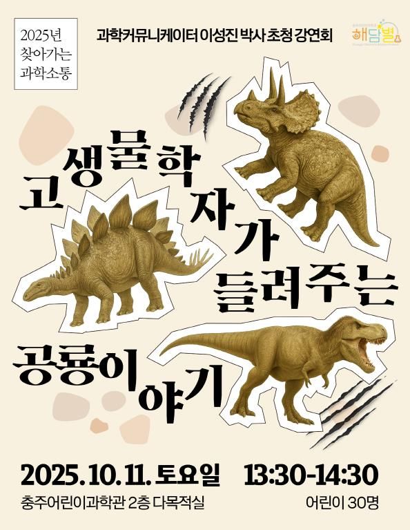 [경남도민뉴스=박만수 기자] 충주어린이과학관은 오는 10월 11일, 과학커뮤니케이터로 활동 중인 고생물학자 이성진 박사를 초청해 초등 저학년 어린이를 위한 특별 강연 ‘고생물학자가 들려주는 공룡 이야기’를 개최한다고 밝혔다.