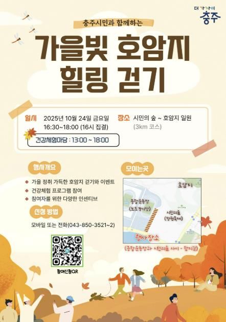 정상구 충주시보건소장은 “호암지는 충주시민이 가장 사랑하는 산책 명소로, 가을빛 풍경 속에서 건강과 즐거움을 동시에 느낄 수 있는 소중한 시간이 될 것”이라며 “많은 시민들이 가족, 이웃과 함께 참여해 일상 속 건강한 변화를 경험하시길 바란다”고 전했다.