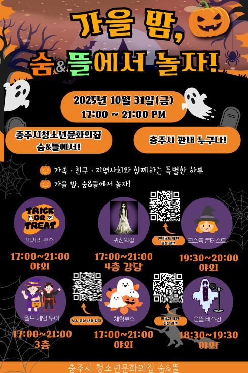 [경남도민뉴스=박만수 기자] 충주시청소년문화의집 숨·뜰에서는 10월 31일 오후 5시부터 9시까지 ‘가을밤, 숨뜰에서 놀자!’ 행사를 진행한다고 밝혔다.