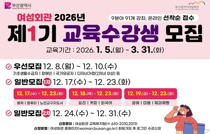 [경남도민뉴스=신석주 기자] 부산시 여성회관은 내일(8일)부터 '2026년 제1기 교육과정' 수강생을 모집한다고 밝혔다.