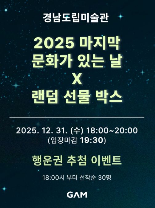 [경남도민뉴스=구인애 기자] 경남도립미술관은 12월 31일 ‘문화가 있는 날’을 맞이해 연말을 함께 즐길 수 있는 특별 이벤트를 마련한다고 밝혔다.