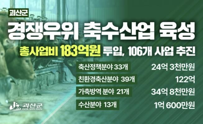 [경남도민뉴스=박만수 기자] 충북 괴산군은 ‘지역과 상생하는 경쟁우위 축수산업 육성’을 비전으로 총사업비 183억원을 투입해 106개 사업을 추진한다고 22일 밝혔다.