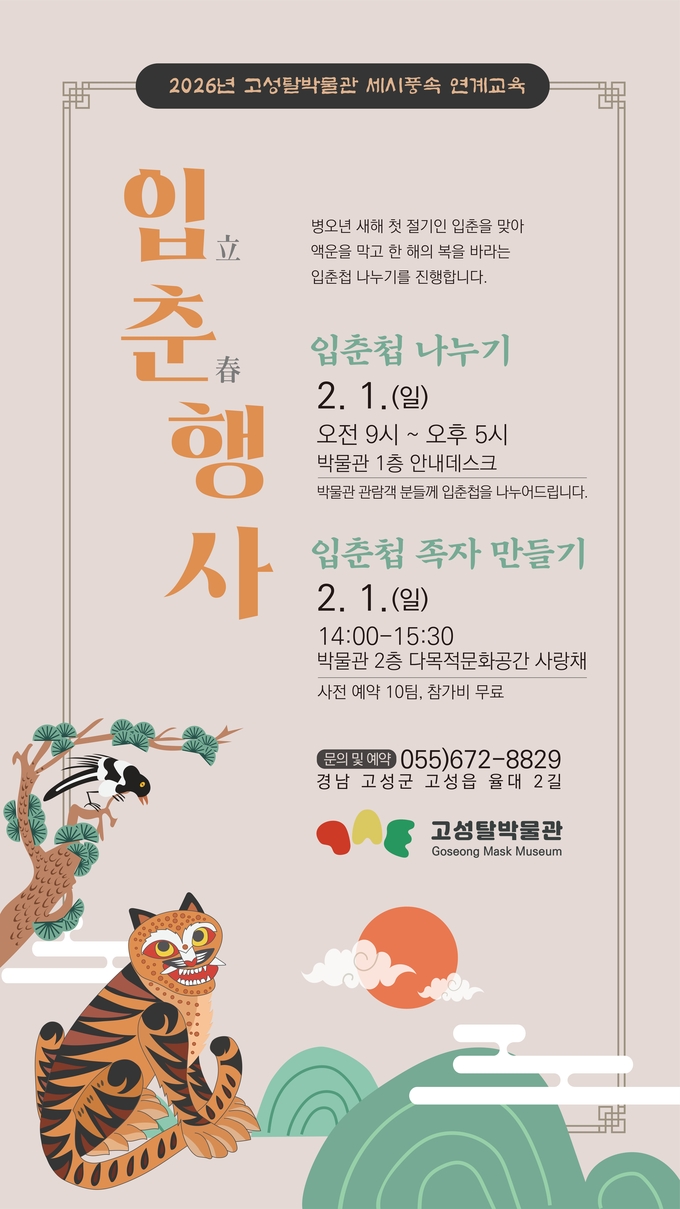 고성탈박물관 관계자는 “새해를 맞아 건강하고 행복한 한 해를 보내길 바라는 전통 세시풍속을 함께 나누기 위해 행사를 열게 됐다”라며, “이번에 전면 리모델링을 한 박물관도 구경하고 입춘첩도 만들어보는 가족 프로그램에도 많은 참여를 바란다”라고 밝혔다.
