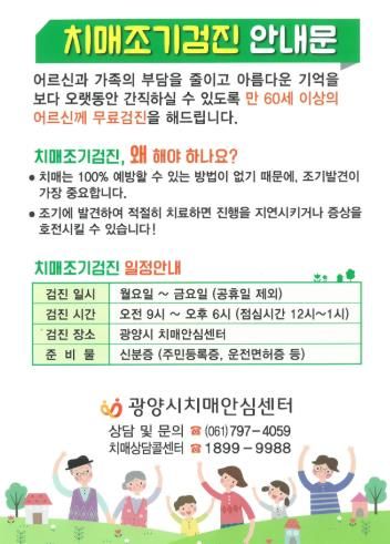 이에 광양시치매안심센터는 특별한 증상이 없더라도 60세 이상 어르신의 경우 연 1회 정기적인 치매 조기검진을 받을 것을 권장하고 있다.