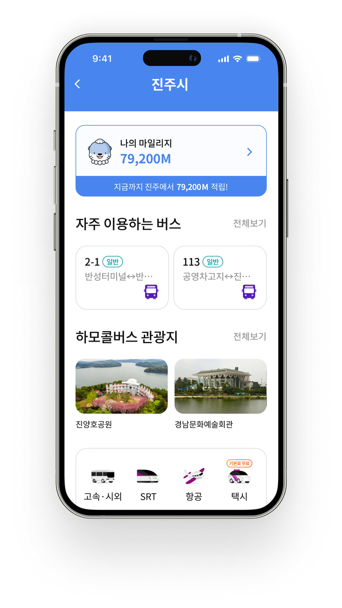 특히 진주시는 ‘티머니GO’에 ‘진주형마스’ 전용 페이지를 만들어 누구든지 진주시에 있는 교통수단을 간편하게 이용이 가능할 뿐만 아니라 주요 관광지와 교통 정보도 얻을 수 있다. 전국 최초로 교통수단 간의 환승 시에 환승 마일리지 적립도 가능한 전국 단위로 플랫폼에 기반한 광역 환승 할인제도를 실시하고 있다.