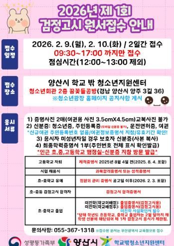 [경남도민뉴스=최미정 기자] 양산시 학교 밖 청소년지원센터는 학교 밖 청소년들의 2026년 제1회 검정고시 응시를 지원하기 위해 대리 원서접수처를 운영한다.
