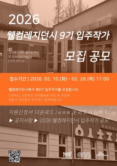 [경남도민뉴스=최미정 기자] (재)김해문화관광재단(대표이사 최석철) 김해문화도시센터는 오는 10일부터 26일까지‘2026 웰컴레지던시 제9기 입주작가’를 모집한다.