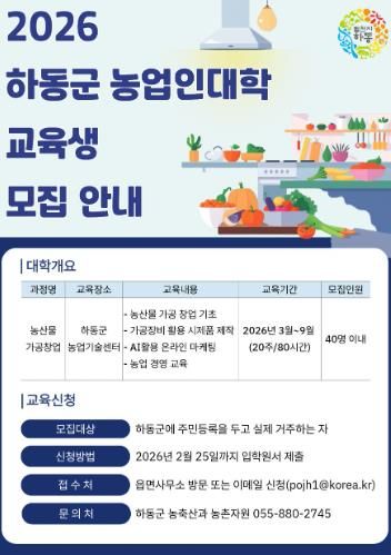 [경남도민뉴스=김태수 기자] 하동군은 농산물 가공 및 창업을 희망하는 군민을 대상으로 전문 인력을 육성하기 위해 ‘2026년 하동군농업인대학’ 교육생을 오는 2월 25일까지 모집한다고 밝혔다.