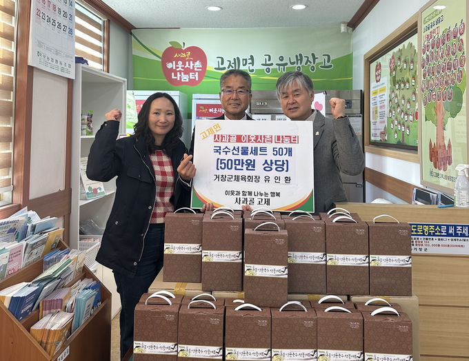 [경남도민뉴스=백형찬 기자] 거창군 고제면은 지난 6일, 유인환 거창군체육회장이 설 명절을 앞두고 지역 내 취약계층을 위해 국수선물세트 50개(50만 원 상당)를 공유냉장고에 기부했다고 밝혔다.