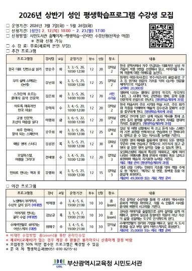 [경남도민뉴스=김채연 기자] 부산광역시립시민도서관(관장 이은경)은 3월부터 5월까지 유아, 어린이, 성인 등 560여 명을 대상으로 26개 평생학습프로그램을 운영한다. 프로그램은 전 연령층의 다양한 학습 수요를 반영해 구성했으며, 특히 어린이 대상 문해력·수리력 등 기초역량 강화 프로그램을 확대 운영한다.