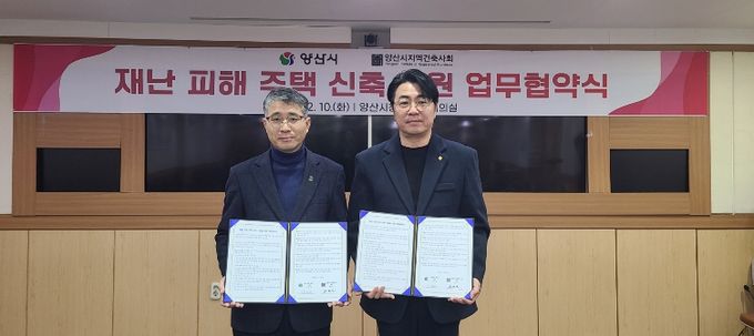 [경남도민뉴스=최미정 기자] 양산시는 지난 10일 시청 소회의실에서 양산시지역건축사회와 함께 '재난피해주택 신축 지원을 위한 업무협약'을 체결했다.