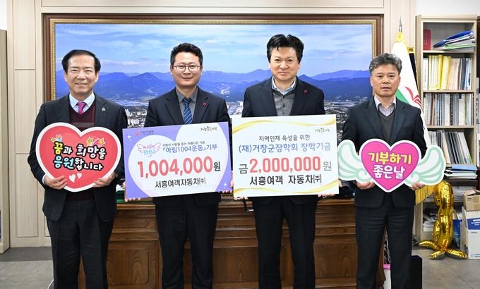 서흥여객자동차(대표 장재영)는 아림1004운동에 100만원 4천 원, 거창군장학회에 200만 원 기탁하며 지역사회 나눔에 동참했고, 나무새 신연숙 대표는 2023년부터 매년 100만 원씩 거창군장학회에 기탁하며 학생들의 꿈을 응원하고 있다.