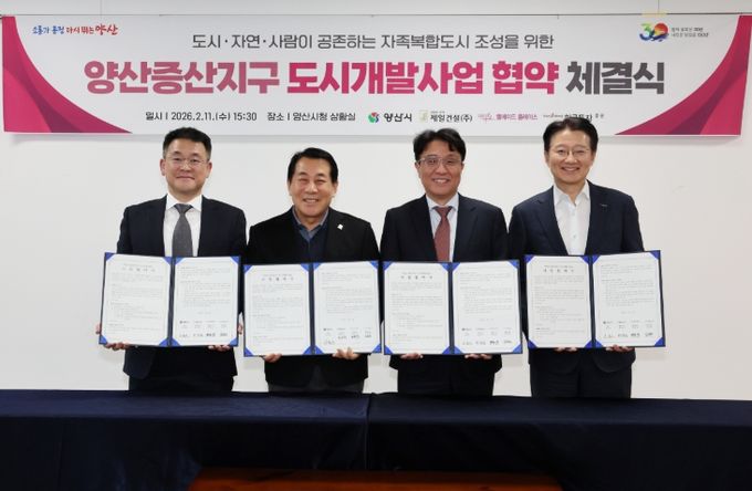 [경남도민뉴스=최미정 기자] 양산시는 물금읍 증산리 일원의 ‘양산증산지구 도시개발사업’ 추진을 위해 11일 제일건설컨소시엄의 대표사 ㈜제일건설, 웰메이드플레이스㈜, 한국투자증권㈜과 사업 협약을 체결했다고 밝혔다.