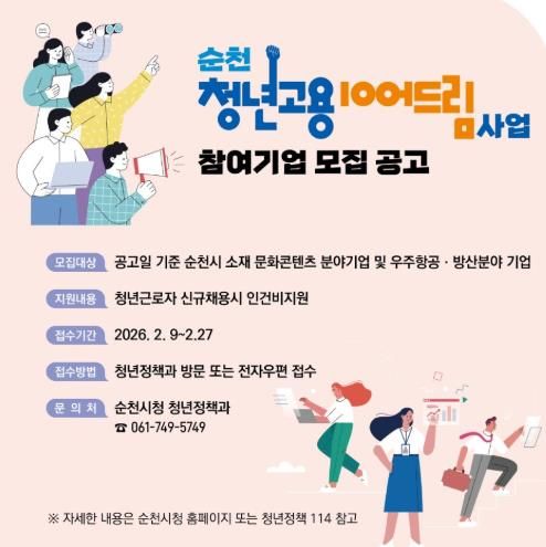 지원 인원은 총 85명으로 모집 기간은 2월 9일부터 27일까지이며, 자세한 사항은 순천시청 누리집 또는 청년정책114 홈페이지를 참고하거나 순천시청 청년정책과 청년일자리팀으로 문의하면 된다.