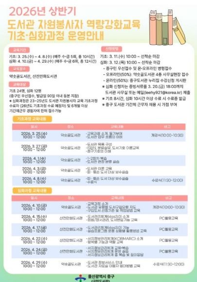 [경남도민뉴스=최재경 기자] 울산 중구가 도서관 운영을 활성화하고 자원봉사 문화를 확산하기 위해 ‘2026년 상반기 도서관 자원봉사자 역량 강화 교육’을 운영한다.