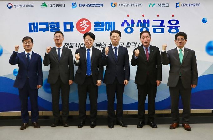 협약식에는 정기환 대구·경북지방중소벤처기업청장, 박기환 대구광역시 경제국장, 박진우 대구신용보증재단 이사장, 김현석 소상공인시장진흥공단 대구경북지역본부장, 류희장 iM뱅크 여신그룹장, 박재청 대구시상인연합회 회장 등이 참석해 정책자금·보증·금융지원 및 경영지원 등을 연계한 협력 금융지원 모델 구축에 힘을 모으기로 했다.