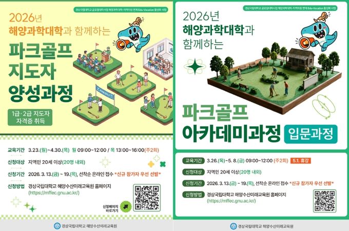 [경남도민뉴스=구인애 기자] 경상국립대학교 해양과학대학 해양수산미래교육원은 3월 23일부터 ‘파크골프 지도자 양성과정(1급·2급 지도자 자격증 취득) 및 파크골프 아카데미’ 2개 과정을 운영한다.