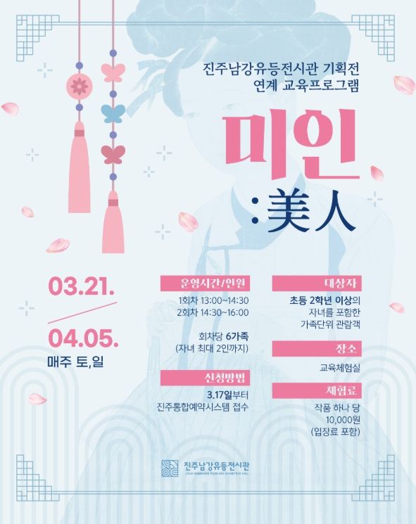 진주남강유등전시관은 기획전 ‘기억, 그리고 찬란히 당신이 서 있는 곳’과 연계해 3월 21부터 4월 5일까지 운영하는 관람객 참여형 교육 프로그램 ‘미인(美人)’의 참여자를 모집한다고 밝혔다.
