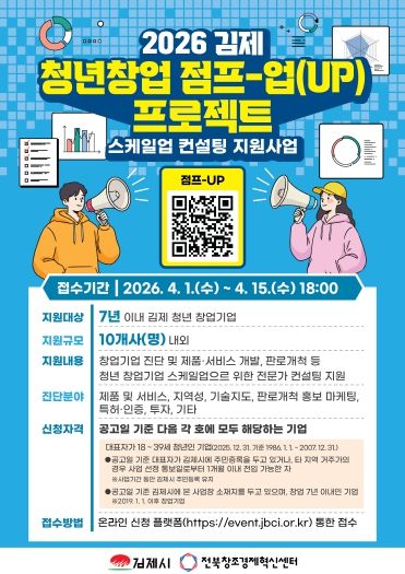 [경남도민뉴스=최인태 기자] 김제시는 청년 창업기업의 경쟁력 강화를 위해 창업청년 스케일업 컨설팅 지원사업 '청년창업 점프-업(UP) 프로젝트'를 본격 추진한다고 밝혔다.