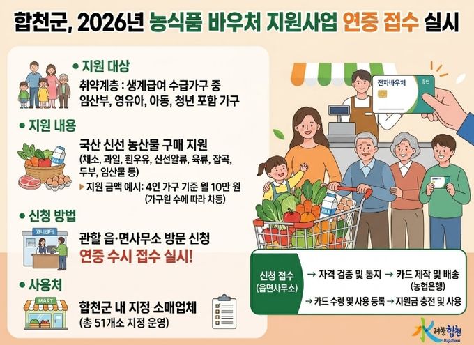 [경남도민뉴스=김춘호 기자] 합천군은 취약계층이 신선한 농산물을 쉽게 맛보고 건강한 식생활을 누릴 수 있도록 ‘2026년 농식품 바우처 지원사업’을 연중 추진하고 있다고 2일 밝혔다.