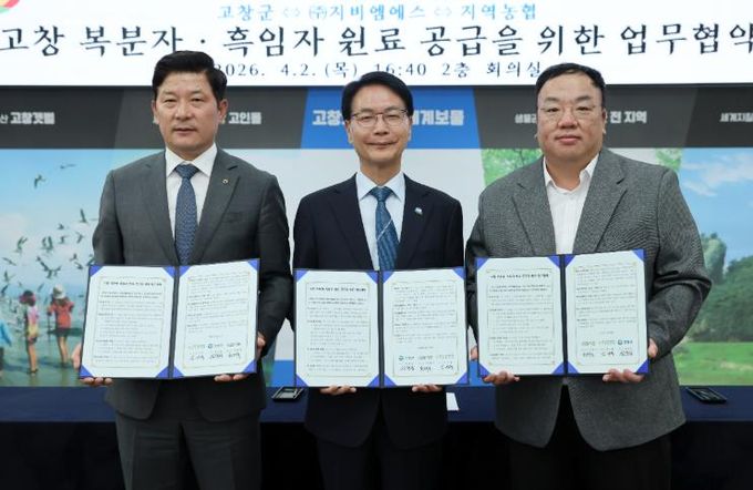 [경남도민뉴스=최인태 기자] 고창군이 지난 2일 오후 군청2층 회의실에서 고창군·㈜지비엠에스·지역농협 5개소와 ‘고창 복분자·흑임자 원료 공급 및 상생발전 업무협약(MOU)’을 체결했다.