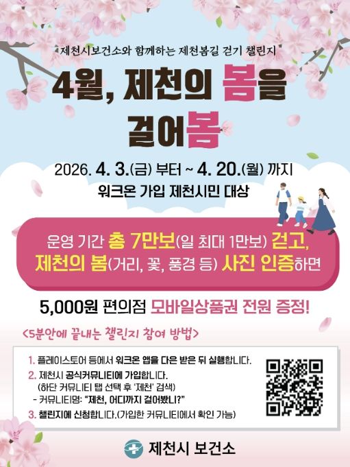 보건소 관계자는 “따뜻한 봄을 맞아 시민들이 일상에서 걷기를 실천할 수 있도록 봄을 주제로 한 워크온 챌린지를 기획했다”며 “아름다운 제천의 봄길을 걸으며 건강까지 챙길 기회가 될 것”이라고 말했다.