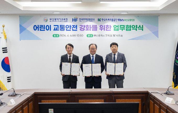 [경남도민뉴스=김채연 기자] 부산광역시교육청은 지난 6일 오후 시교육청 회의실에서 어린이 교통사고 예방과 안전한 통학환경 조성을 위해 한국주택금융공사, 한국도로교통공단 tbn부산교통방송과 ‘어린이 교통안전 강화를 위한 업무 협약’을 체결했다.