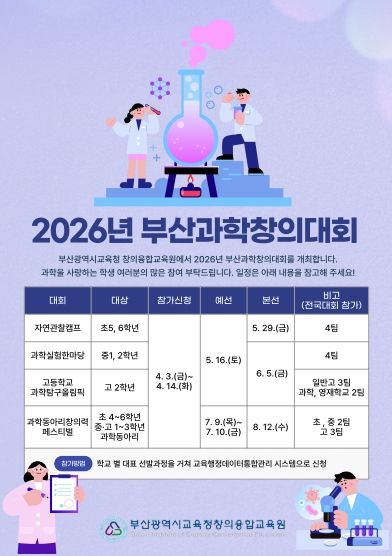[경남도민뉴스=김채연 기자] 부산광역시교육청창의융합교육원은 오는 14일까지 과학 분에야 재능과 관심이 있는 부산 지역 초·중·고등학생을 대상으로 ‘2026년 부산과학창의대회’ 참가 신청을 받는다고 8일 밝혔다.