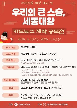 [경남도민뉴스=구인애 기자] 경상국립대학교 국어문화원은 제629돌 세종 나신 날(5월 15일)을 기념하여 ‘우리의 큰 스승, 세종대왕 카드뉴스 제작 공모전’을 개최한다.