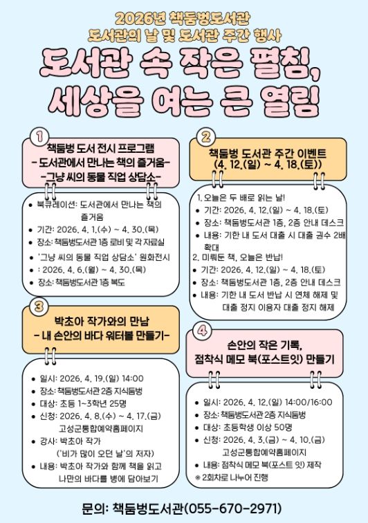 [경남도민뉴스=김태수 기자] 책둠벙도서관은 제62회 도서관 주간을 맞아 지역 주민의 독서 문화 활성화와 도서관 이용 증진을 위해 다양한 행사를 운영한다.