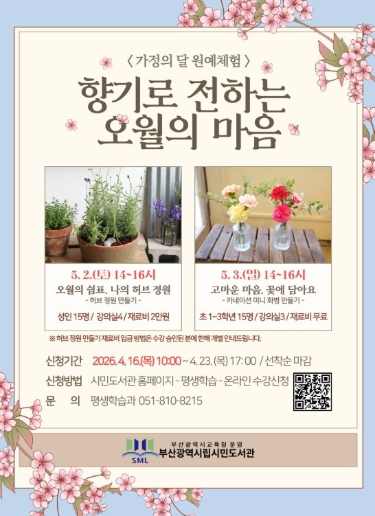[경남도민뉴스=김채연 기자] 부산광역시립시민도서관은 오는 5월 2일과 3일 시민도서관 강의실에서 성인과 초등학생 30명을 대상으로 가정의 달 원예체험 ‘향기로 전하는 오월의 마음’을 운영한다.