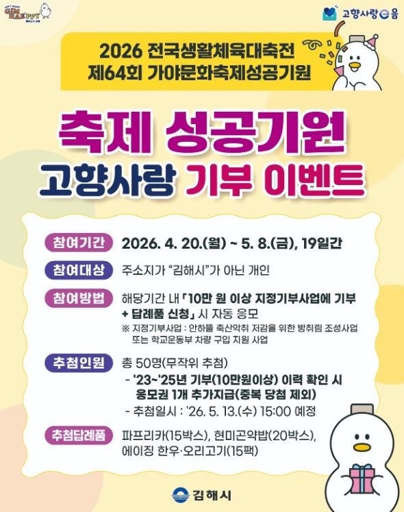 김해시 관계자는 “이번 이벤트는 대규모 체육·문화 행사의 성공을 기원하고 지역의 시급한 현안을 해결하는 지정기부 사업을 널리 알리기 위해 기획됐다”며, “고향을 사랑하는 마음이 담긴 기부가 지역 발전의 큰 힘이 되는 만큼 많은 분의 적극적인 관심과 참여를 부탁드린다”고 전했다.