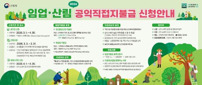 [경남도민뉴스=최인태 기자] 전라남도는 임업의 공익기능 증진과 임업인의 안정적 소득 보전을 위해 2026년 임업·산림 공익직접지불금 신청을 30일까지 접수한다고 밝혔다.