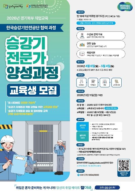 [경남도민뉴스=김동규 기자] 경기도일자리재단은 승강기 전문 인력 양성을 통해 일자리 문제 해결과 지역경제 활성화를 추진하고자 ‘2026년 승강기 전문가 양성 과정’ 교육생을 모집한다고 21일 밝혔다.