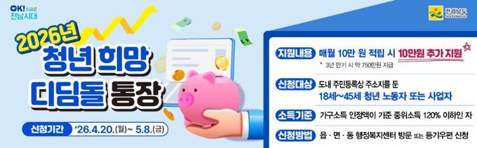 윤연화 전남도 인구청년이민국장은 “청년 희망디딤돌 통장은 일하는 청년이 안정적으로 목돈을 마련하도록 돕는 대표적 자산형성 정책”이라며 “앞으로도 청년의 지역 정착과 자립을 지원하는 맞춤형 정책을 지속해서 확대하겠다”고 말했다.