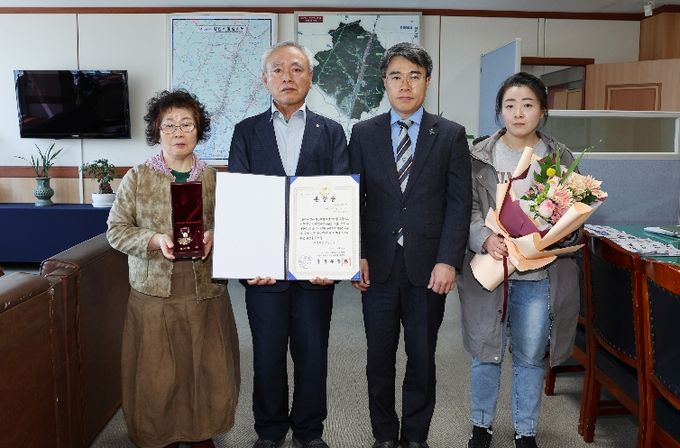 [경남도민뉴스=최미정 기자] 양산시는 21일 6.25전쟁에 참전해 공을 세운 故 권오수 하사의 자녀 권용득씨(평산동 거주)에게 국방부장관을 대신해 훈장증과 화랑무공훈장을 전수했다.