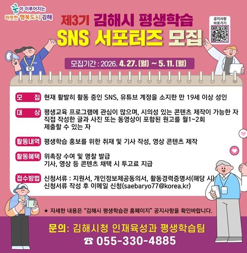 [경남도민뉴스=최미정 기자] 김해시는 27일부터 5월 11일까지 제3기 김해시 평생학습 SNS 서포터즈를 모집한다.